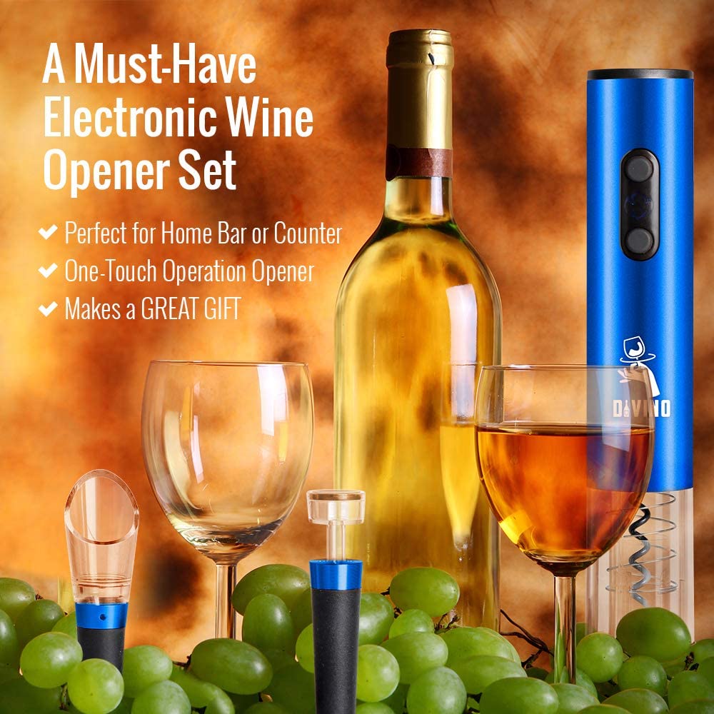 Powerful Electric Wine Opener BLUE Set – Automatic – Battery Operated with Foil Cutter, Vacuum Stopper & Aerator